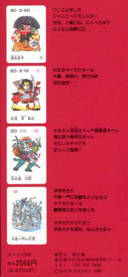 ジャパニーズモンスター、天狗、九尾の狐、のっぺらぼうなど総勢50匹。 対するキャラクターは、弁慶、源頼光、西行法師、坂田金時・・・ さあ、誰がどれだけ妖怪たちを退治、成仏させるか。